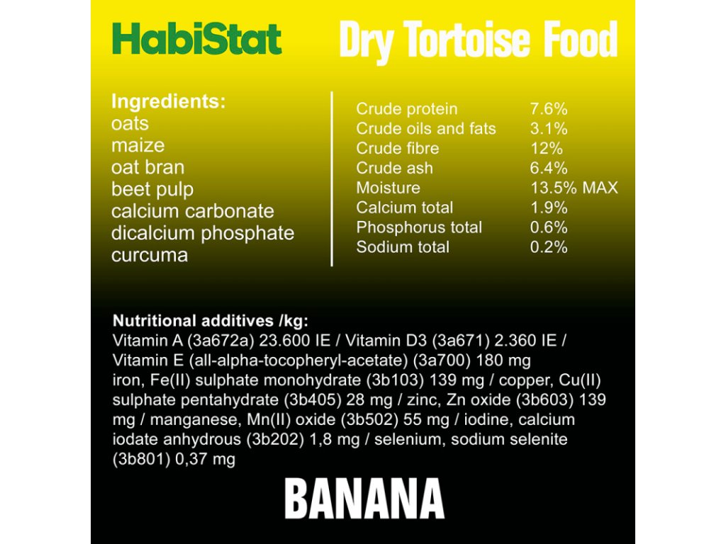 Habistat Tortoise Food Banana je bohaté na vlákninu, vitamíny a minerály a obsahuje vysoký podíl vápníku, který je nezbytný pro silný krunýř a zdravé kosti.