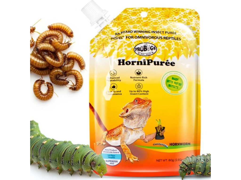 Dopřejte svým plazům dávku bílkovin s Probugs HorniPurée, prémiovým hmyzím pyré vyrobeným z housenek lišaje tabákového a moučných červů. Toto 80 g balení, speciálně navržené pro hmyzožravé a všežravé plazy, nabízí snadno dostupné krmivo podporující růst, energii a celkové zdraví. Housenky lišaje tabákového jsou přirozeně bohatí na vápník, bílkoviny a esenciální živiny. Navíc jsou pro ještěry velmi chutné.