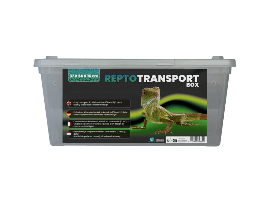 REPTO plastová dóza v transparentní barvě s lomeným víčkem a větracími otvory (Ø 4 mm) v bočních stěnách a ve víčku. Uvnitř se navíc nachází plastová miska v transparentní barvě o průměru 6,5 cm a výšce 2 cm. Tuto misku je možné připevnit do rohu na dně dózy a bezpečně ji použít na potravu nebo na vodu. Lomené víčko lze otvírat z obou stran, kdy z jedné se otevře pouze 1/3 víčka a z druhé strany se otevřou 2/3 víčka.