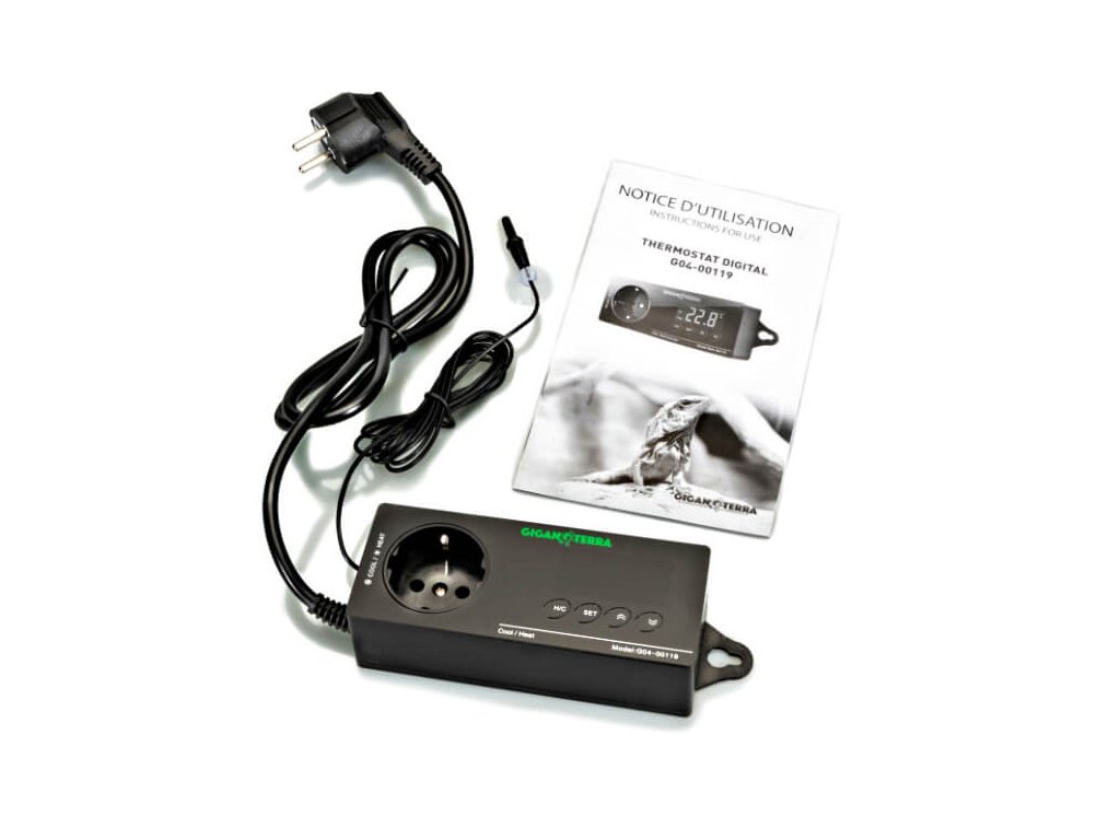 GiganTerra Digitální termostat Basic s vodotěsným čidlem o délce 1,8 m. Díky zásuvce se na něho snadno připojí tepelný zdroj (topný kabel, topné fólie, tepelný zářič) nebo chlazení (ventilátor), pomocí kterého koriguje případné změny teploty.